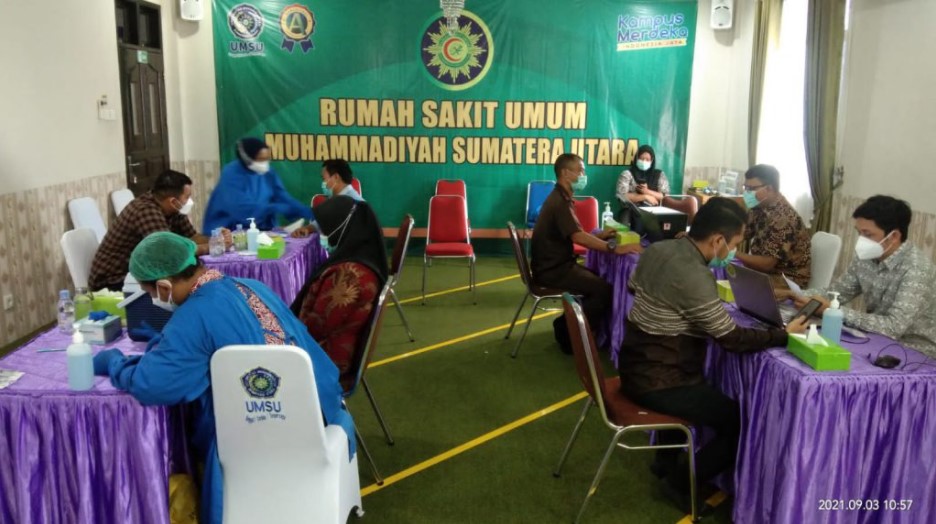 Sebagai upaya memberikan perlindungan dan kekebalan tubuh yang maksimal dari serangan virus Covid- 19, Rumah Sakit Umum Muhammadiyah Sumatera Utara (RSUMSU), melakukan penyuntikan Vaksin tahapke-tiga (booster) bagi tenaga kesehatan (nakes) maupun tenaga penunjang lainnya, Jum’at (3/9/2021).