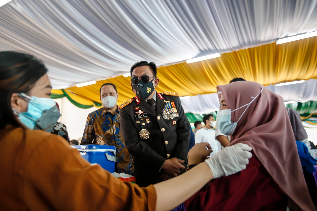 Kapolda Sumatera Utara Irjen Pol Panca Putra Simanjuntak didampingi Rektor UMSU Prof. Agussani MAP, Waka Polda Sumut Brigjen Pol Dadang Hartanto, Wakil Rektor II Dr. Akrim dan Wakil Rektor III Dr. Rudianto meninjau langsung pelaksanaan vaksinasi Covid-19 bagi mahasiswa di Kampus Pasca Sarjana Universitas Muhammadiyah Sumatera Utara (UMSU), Selasa (5/10/21).